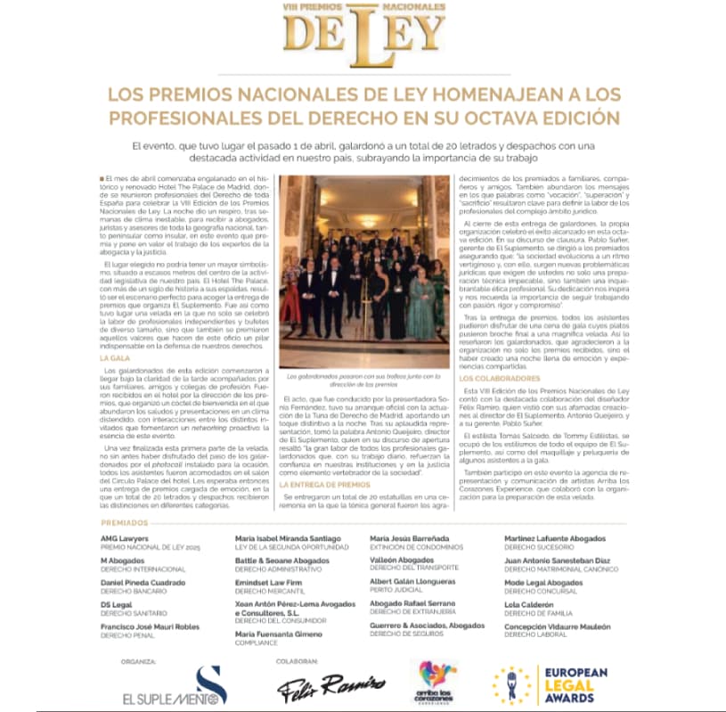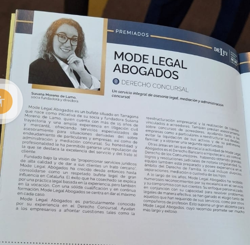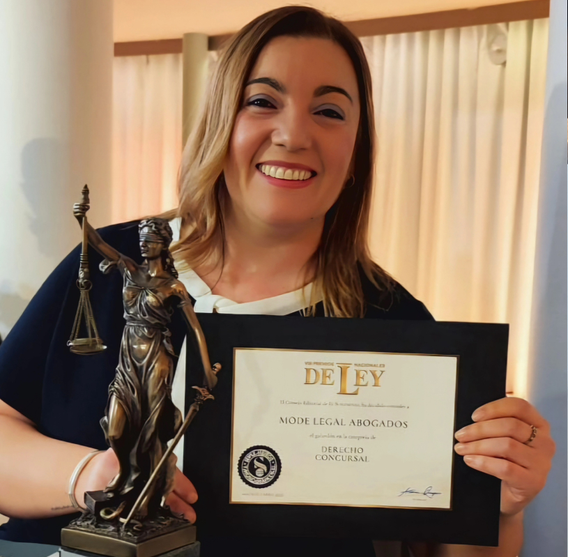 MODE LEGAL ABOGADOS a través de su socia y fundadora la abogada SUSANA MORENO DE LAMO, ha recibido el Premio Nacional de Ley en Derecho Concursal 2025, en la VIII EDICION DE PREMIOS NACIONALES DE LEY que se celebró el pasado dia 1 de Abril de 2025, en una gala organizada por El Suplemento.